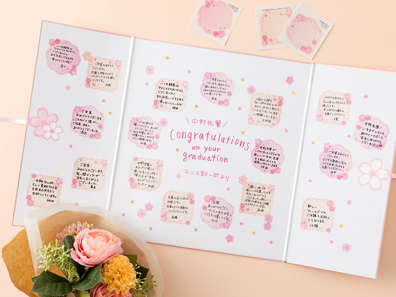 寄せ書きシールを貼り、余白に『カラー色紙用シール<S> 半透明 桜柄』の飾りシールを散らすように貼ると、華やかに仕上がります。